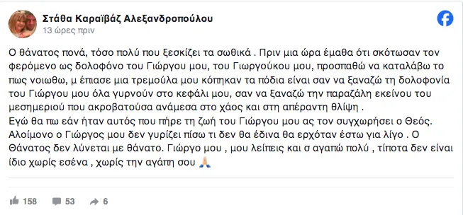 «Ο θάνατος πονά, τόσο πολύ που ξεσκίζει τα σωθικά. Πριν μια ώρα έμαθα ότι σκότωσαν τον φερόμενο ως δολοφόνο του Γιώργου μου, του Γιωργούκου μου, προσπαθώ να καταλάβω το πως νιώθω, μ’ έπιασε μια τρεμούλα μου κόπηκαν τα πόδια είναι σαν να ξαναζώ τη δολοφονία του Γιώργου μου όλα γυρνούν στο κεφάλι μου, σαν να ξαναζώ την παραζάλη εκείνου του μεσημεριού που ακροβατούσα ανάμεσα στο χάος και στη απέραντη θλίψη», γράφει η Στάθα Καραϊβάζ.