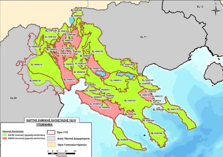 Ο παρακάτω χάρτης (Χάρτης Χημικής Κατάστασης ΥΔ10 – Ειδική Γραμματεία Υδάτων-ΥΠΕΝ) αποτυπώνει τη χημική κατάσταση των υπόγειων υδατικών συστημάτων στο Υδατικό Διαμέρισμα Κεντρικής Μακεδονίας (03/2024). Με πράσινο σημειώνονται τα συστήματα σε καλή χημική κατάσταση και με κόκκινο όσα κατατάσσονται σε κακή, περιέχουν δηλαδή τουλάχιστον έναν ρυπαντικό παράγοντα που τα καθιστά μη ποιοτικά. Να σημειωθεί πως σύμφωνα με τον χάρτη, το κόκκινο χρώμα καταλαμβάνει περίπου το 28% της συνολικής έκτασης της Κεντρικής Μακεδονίας.