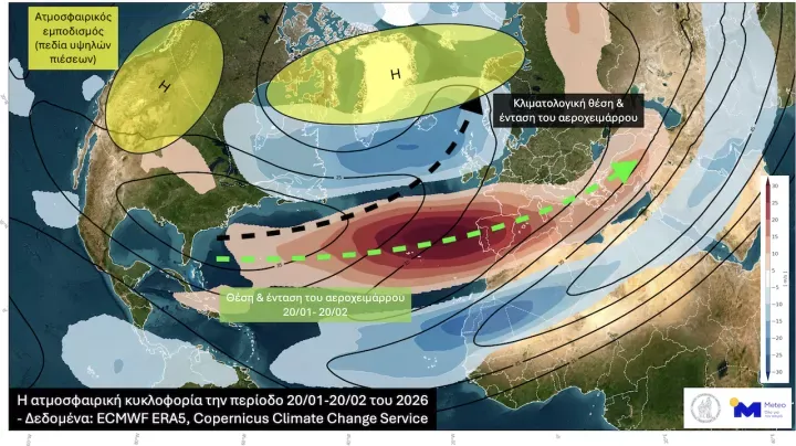 Ειδικότερα, το χρονικό διάστημα από τις 20 Ιανουαρίου έως τις 20 Φεβρουαρίου του 2026 χαρακτηρίστηκε από ένα πολύ ενεργό (ισχυρότερο του κανονικού) και ζωνικό (με προσανατολισμό από δύση προς ανατολή) αεροχείμαρρο που «παγιδεύτηκε» σε πολύ νότια γεωγραφικά πλάτη (ασυνήθιστα νότια σε σχέση με την μέση κλιματολογική του θέση - Εικόνα 1).