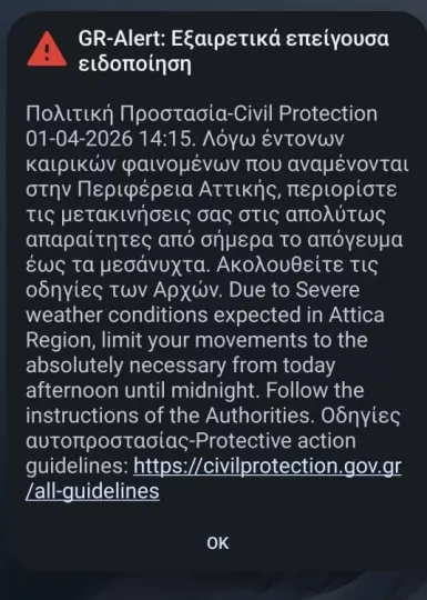 Νωρίτερα, μήνυμα από το 112 εστάλη σε όσους βρίσκονται στην Αττική λόγω των έντονων φαινομένων που αναμένονται από την κακοκαιρία Erminio.