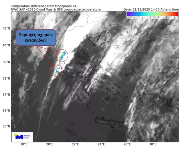 Παράλληλα σε σχετική εικόνα παρουσιάζεται η εκτίμηση της θέσης ισχυρών καταιγιδοφόρων κυτάρρων. Αυτά, όπως επισημαίνει το meteo.gr/ ΕΑΑ, εντοπίζονται ως περιοχές όπου η θερμοκρασία της κορυφής του νέφους (υπολογισμένη από δορυφορικά δεδομένα) είναι χαμηλότερη αυτής της τροπόπαυσης (όπως εκτιμάται από δεδομένα αριθμητικών μοντέλων). Πρόκειται δηλαδή , όπως υπογραμμίζεται, για περιοχές όπου τα ανοδικά ρεύματα της καταιγίδας είναι τόσο ισχυρά ώστε να ξεπερνούν το φράγμα της τροπόπαυσης ("overshooting tops"). «Όσο μεγαλύτερη είναι αυτή η διαφορά τόσο ισχυρότερη εν γένει είναι η καταιγίδα», σημειώνει το meteo.gr/ ΕΑΑ.