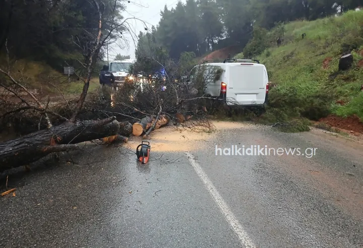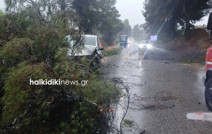 Στην επαρχιακή οδό Σιθωνίας, μεταξύ Νικήτης και Μεταμόρφωσης, σημειώθηκε τροχαίο όταν όχημα προσέκρουσε σε πεύκο που είχε πέσει στο οδόστρωμα λόγω των ανέμων. Στο σημείο επικρατούσε έντονη κακοκαιρία, με περιορισμένη ορατότητα και ολισθηρό δρόμο, ενώ άμεση ήταν η επέμβαση εθελοντών και της Πυροσβεστικής για την απομάκρυνση του δέντρου.