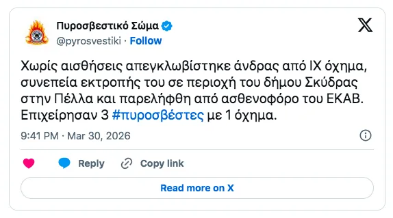 Το περιστατικό σημειώθηκε λίγο πριν τις 20:00 στην επαρχιακή οδό Βέροιας – Σκύδρας, κοντά στο χωριό Ρίζο του δήμου Σκύδρας. Στο σημείο έσπευσαν άμεσα δυνάμεις της Πυροσβεστικής, με τρεις πυροσβέστες και ένα όχημα, προκειμένου να απεγκλωβίσουν τον οδηγό από τα συντρίμμια.