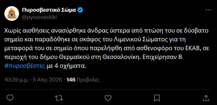Σύμφωνα με νεότερη ενημέρωση από την Πυροσβεστική, ο άνδρας ανασύρθηκε χωρίς τις αισθήσεις του από το δύσβατο σημείο.