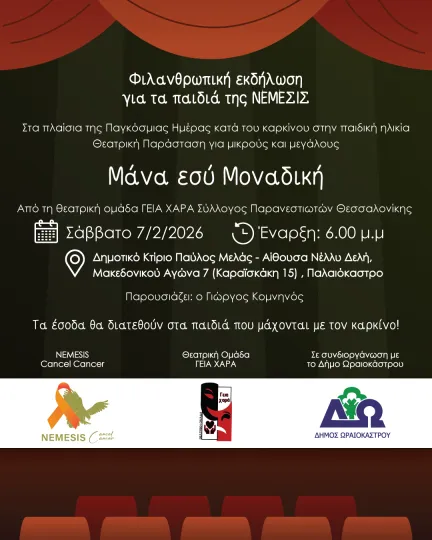 Πιο συγκεκριμένα, η ΝΕΜΕΣΙΣ, η Αντιδημαρχία Παιδείας του Δήμου Ωραιοκάστρου και η ερασιτεχνική θεατρική ομάδα “ΓΕΙΑ ΧΑΡΑ” - του συλλόγου Παρανεστιωτών Θεσσαλονίκης, ενώνουν τις δυνάμεις τους και πραγματοποιούν φιλανθρωπική εκδήλωση για τους τεράστιους μαχητές μας.