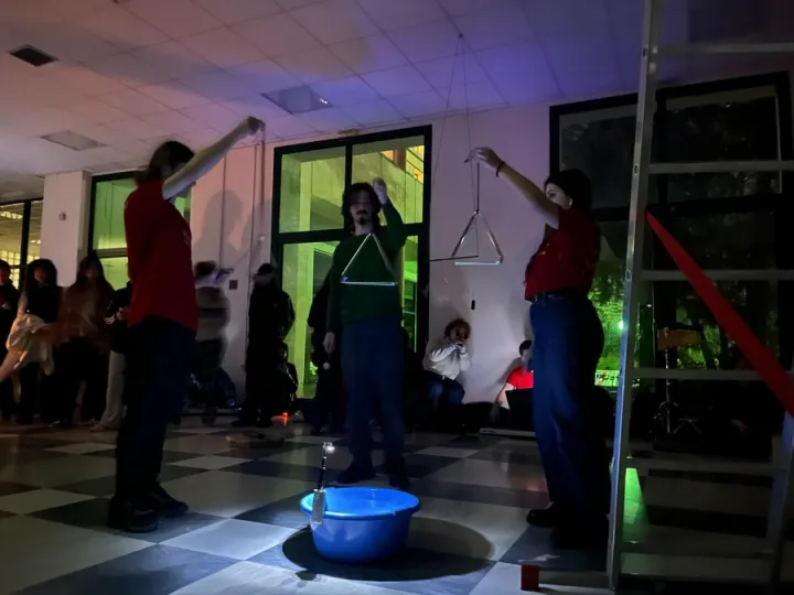 Μάλιστα, κατά τη διάρκεια της εκδήλωσης, το κοινό δεν παρέμεινε στατικό αλλά κλήθηκε να μετακινηθεί μέσα στον χώρο, όπου είχαν εγκατασταθεί πολλά τρίγωνα, διαμορφώνοντας ένα ιδιαίτερο ηχητικό και οπτικό περιβάλλον που καλούσε το κοινό να το ανακαλύψει.