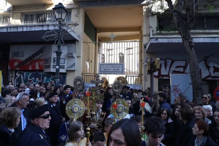 Η πομπή ξεκίνησε στις 17:00, χοροστατούντος του Μητροπολίτη Θεσσαλονίκης Φιλόθεου, με τους πιστούς να ψάλλουν το «Ω γλυκύ μου έαρ» υπό τη συνοδεία φιλαρμονικής ορχήστρας. Καθ’ όλη τη διαδρομή, στην οδό Ίωνος Δραγούμη, αντηχούσαν τα εγκώμια «Η ζωή εν τάφω», «Άξιον εστί» και «Αι γενεαί πάσα».