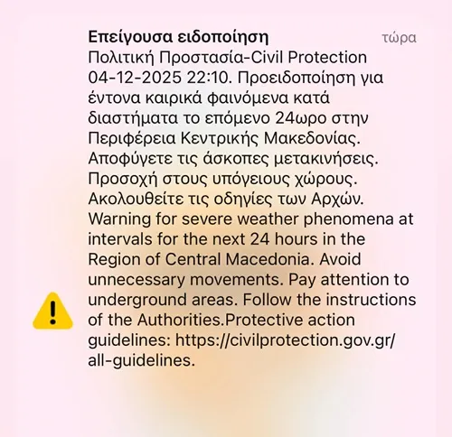 Η πολιτική προστασία προειδοποιεί με επικίνδυνα καιρικά φαινόμενα το επόμενο 24ωρο σε περιοχές της Κεντρικής Μακεδονίας και συστήνει να αποφεύγονται οι μετακινήσεις.