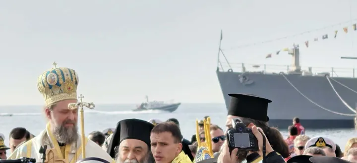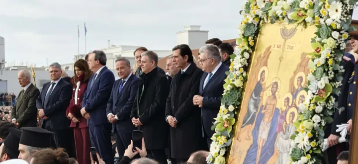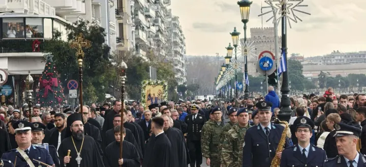 Αμέσως μετά την ολοκλήρωση της τελετής, όλο το εκκλησίασμα, ιερουργούντος του Παναγιωτάτου Μητροπολίτη Θεσσαλονίκης, κ. Φιλόθεου, μετέβη με λιτανευτική πομπή στην Α΄ Προβλήτα του λιμανιού της Θεσσαλονίκης, για την Τελετή του Καθαγιασμού των υδάτων και τη ρίψη του Σταυρού στα νερά του Θερμαϊκού.