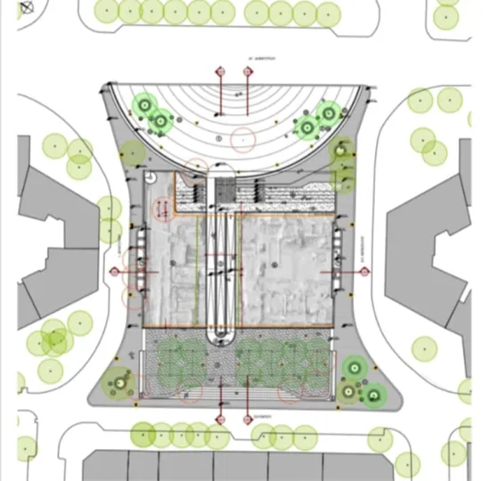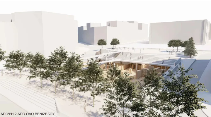 - ανάμεσα στα δύο επίπεδα θα διαμορφωθεί μία διαδρομή μεγάλης κλίμακας, η οποία θα διασχίζει τον αρχαιολογικό χώρο και θα ενώνει τα δύο τμήματα της πλατείας,