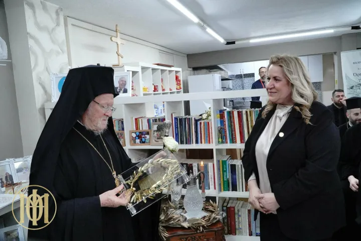 Από την πλευρά της, η κ. Φράγκου χάρισε στον Παναγιώτατο ένα χρυσό στεφάνι ελιάς με χρυσή πλάκα, πάνω στην οποία χαράχτηκε ένα μικρό απόσπασμα από το 4ο βιβλίο της, αφιερωμένο στα 34 χρόνια της Πατριαρχικής του πορείας.