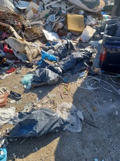 Στην καρότσα του οχήματος υπήρχαν άλλες 26 νάιλον σακούλες μπαζών, καθώς και σίδερα σκραπ μετάλλων που δεν πρόλαβε να απορρίψει.