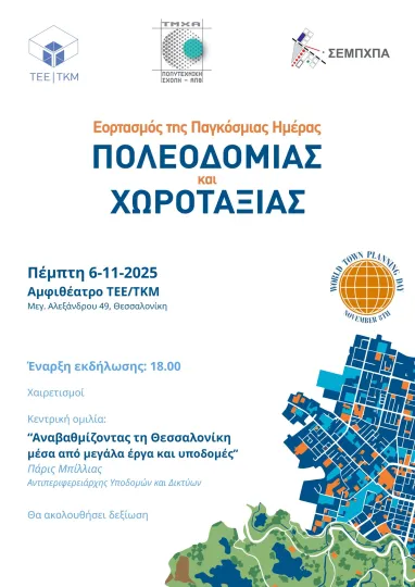 Στην εκδήλωση θα απευθύνουν χαιρετισμό ο Πρόεδρος του ΤΕΕ/ΤΚΜ, Ηλίας Περτζινίδης, ο Πρόεδρος του Τμήματος Μηχανικών Χωροταξίας και Ανάπτυξης του Αριστοτελείου Πανεπιστημίου, Καθηγητής Νικόλας Καρανικόλας, και ο Πρόεδρος του Συλλόγου Ελλήνων Μηχανικών Πολεοδομίας, Χωροταξίας και Περιφερειακής Ανάπτυξης/Περιφερειακό Τμήμα Βορείου Ελλάδος, Νίκος Κουτσομάρκος.