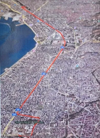 Μετάβαση: Σταθμός Μετεπιβίβασης Ν. Ελβετίας, Μιχ. Ψελλού, δεξιόστροφος ελιγμός στην παράπλευρη Ε.Ο. Θεσσαλονίκης- Ν. Μουδανίων, Λεωφ. Κωνσταντίνου Καραμανλή, Εγνατία, Μοναστηρίου, Νέος Σιδηροδρομικός Σταθμός.