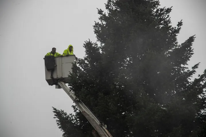 Με ειδικό γερανοφόρο όχημα κλιμάκιο του δήμου έστησε το δέντρο και τις επόμενες ώρες θα προχωρήσει στον στολισμό και την τοποθέτηση λαμπιονιών.