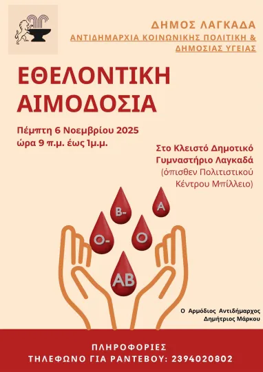 Η δράση πραγματοποιείται σε συνεργασία με το Τμήμα Αιμοδοσίας του Γ.Α.Ν.Θ. “ΘΕΑΓΕΝΕΙΟ” και έχει στόχο την ενίσχυση της Τράπεζας Αίματος του δήμου Λαγκαδά, που βρίσκεται πάντα δίπλα σε κάθε συνδημότη που έχει ανάγκη.