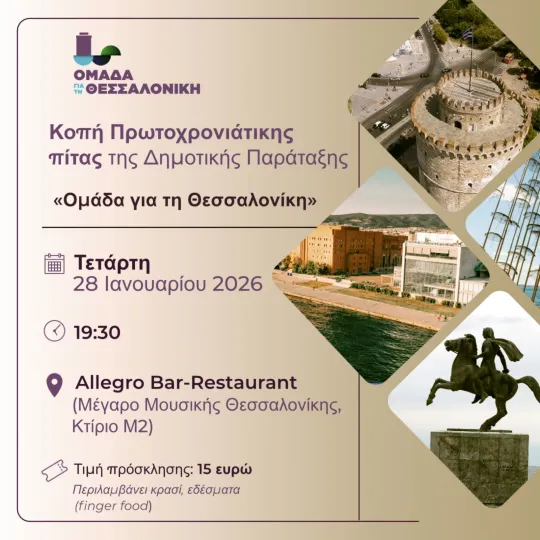 «Η εκδήλωση αποτελεί μια ανοιχτή συνάντηση μελών, φίλων και υποστηρικτών της παράταξης, σε κλίμα γιορτής και ανταλλαγής ευχών για τη νέα χρονιά, με κοινό στόχο τη συνέχιση της συλλογικής προσπάθειας για μια σύγχρονη, βιώσιμη και ανθρώπινη Θεσσαλονίκη», αναφέρει η ανακοίνωση της δημοτικής παράταξης.