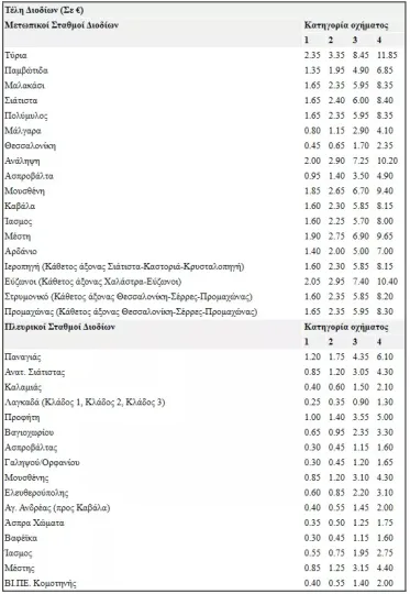 Αναλυτικά, οι τιμές ανά μετωπικό και πλευρικό σταθμό διοδίων θα διαμορφωθούν ως εξής: