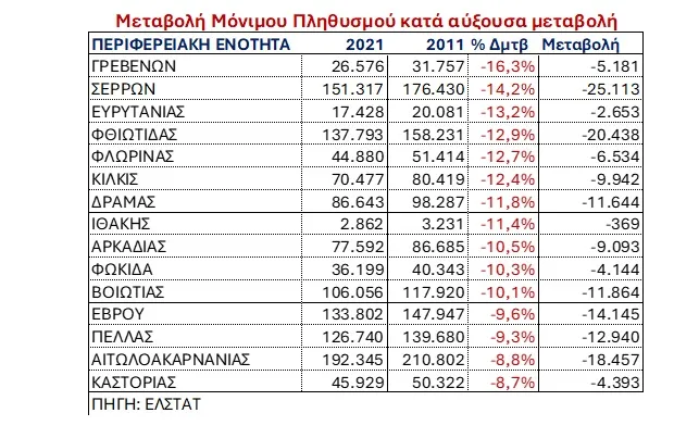 Συγκεκριμένα, με πρώτο τον νομό Γρεβενών με ποσοστό μείωσης 16,3% και τελευταίο από τους 15 νομούς, τον νομό Καστοριάς με ποσοστό μείωσης 8,7%. Να σημειωθεί ότι το μέσο ποσοστό μείωσης του πληθυσμού μεταξύ των ετών 2011 και 2021 ήταν 3,1%.