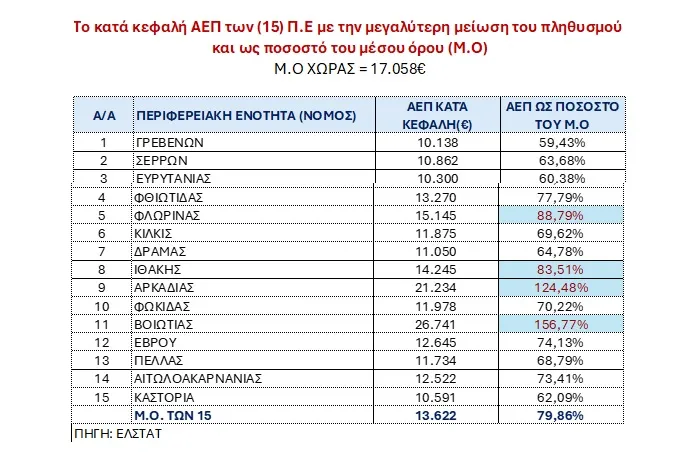 Στον πίνακα (2) παρουσιάζεται το ΑΕΠ κατά κεφαλήν των 15 νομών που παρουσίασαν τη σημαντικότερη μείωση του πληθυσμού.