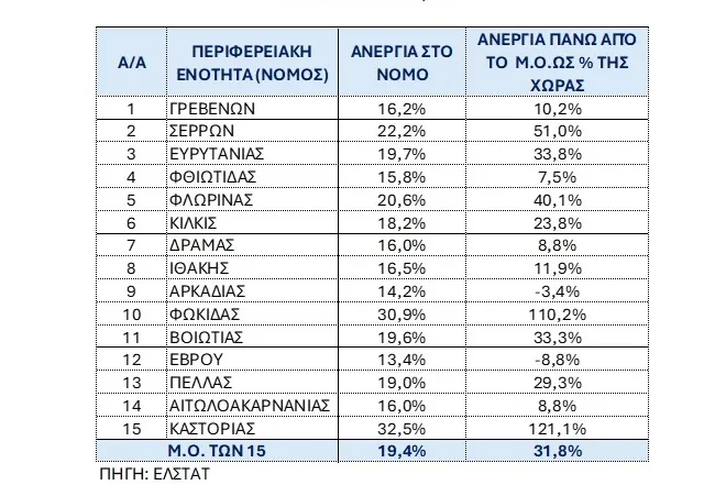 Η ανεργία στους νομούς που παρουσίασαν τη μεγαλύτερη μείωση του πληθυσμού