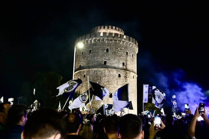 Ο Δημήτρης Κούβελας με τα παιδιά του στον Λευκό Πύργο παηγυρίζουν για την κατάκτηση του Κυπέλλου Ελλάδας 2021