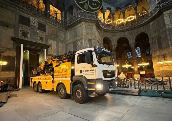 Φωτογραφίες από το εσωτερικό του κτιρίου δείχνουν ένα φορτηγό με γερανό να πατάει στο ιστορικό δάπεδο και να είναι σταθμευμένο πάνω σε προσωρινά προστατευτικά πάνελ, γεγονός που γεννά ερωτήματα για το αν το εύθραυστο έδαφος προστατεύεται επαρκώς όσο συνεχίζονται οι εργασίες.