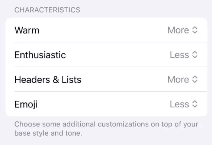 Αυτές οι επιλογές (καθώς και παρόμοιες ρυθμίσεις για τη χρήση τίτλων και λιστών από το ChatGPT) εμφανίζονται πλέον στο μενού Προσωποποίησης και μπορούν να οριστούν σε Περισσότερο, Λιγότερο ή Προεπιλογή.