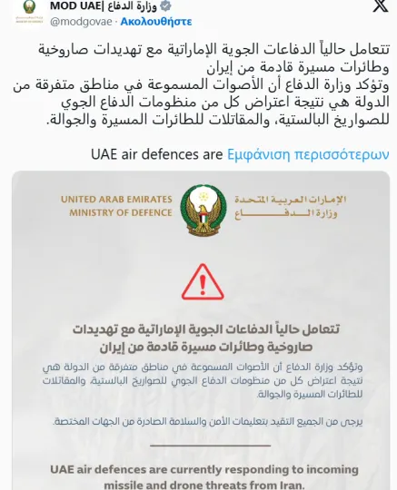 Τα συστήματα αεράμυνας στα Ηνωμένα Αραβικά Εμιράτα ανταποκρίνονται αυτή τη στιγμή σε απειλή πυραύλου, ανακοίνωσε η Εθνική Αρχή Διαχείρισης Εκτάκτων Αναγκών, Κρίσεων και Καταστροφών της χώρας μέσω ανάρτησης στην πλατφόρμα X.