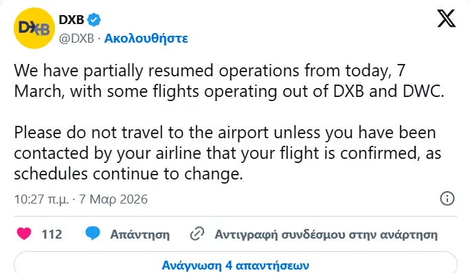 Η αεροπορική εταιρία Emirates ανακοίνωσε σήμερα ότι οι όλες οι πτήσεις προς και από το Ντουμπάι αναστέλλονται μέχρι νεωτέρας, σύμφωνα με ανάρτηση της εταιρείας στο Χ.