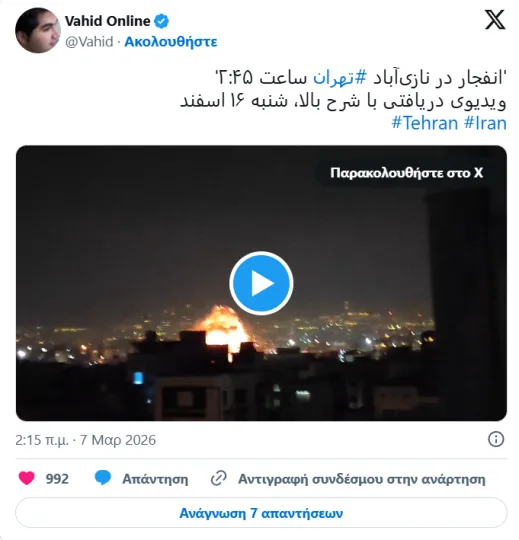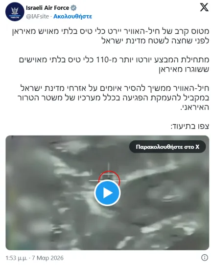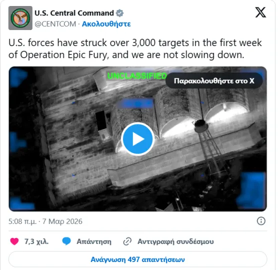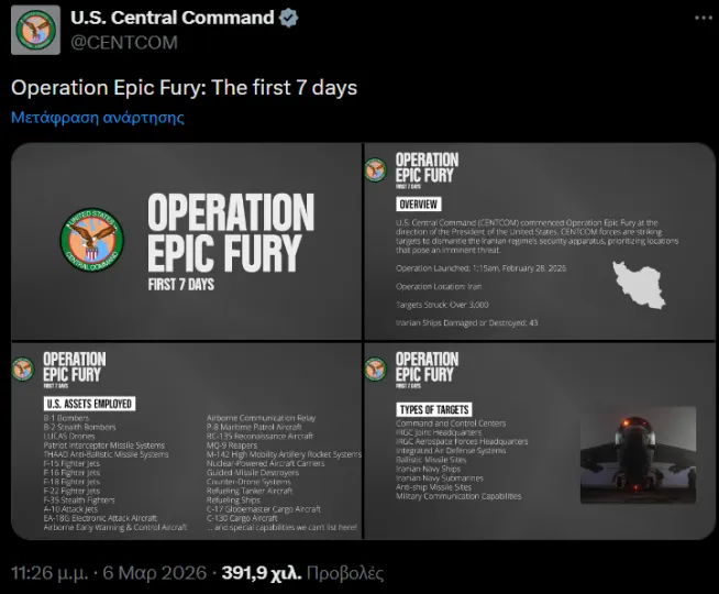 06:26 Νέα ανάρτηση της CENTCOM για τις επιθέσεις εναντίον του Ιράν