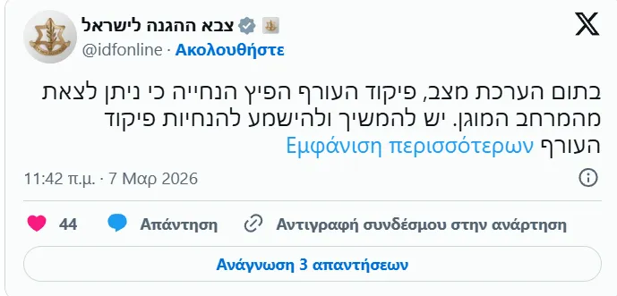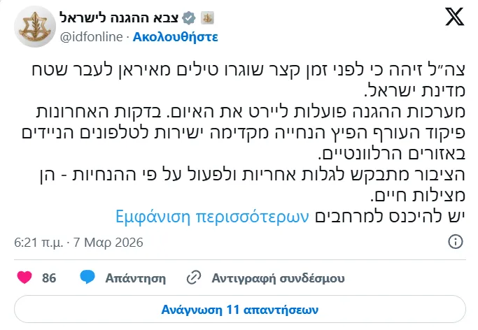 «Οι Ισραηλινές Ένοπλες Δυνάμεις (IDF) ανακοίνωσαν ότι πρόσφατα εκτοξεύτηκαν πύραυλοι από το Ιράν προς το έδαφος του Κράτους του Ισραήλ. Τα αμυντικά συστήματα εργάζονται για την αναχαίτιση της απειλής. Τα τελευταία λεπτά, η Διοίκηση Εσωτερικού Μετώπου έχει διανείμει προειδοποιήσεις απευθείας σε κινητά τηλέφωνα στις σχετικές περιοχές. Το κοινό καλείται να επιδείξει υπευθυνότητα και να ενεργήσει σύμφωνα με τις οδηγίες - σώζουν ζωές. Πρέπει να εισέλθετε στις προστατευόμενες περιοχές μόλις λάβετε την ειδοποίηση και να παραμείνετε εκεί μέχρι νεωτέρας. Η έξοδος από την προστατευόμενη περιοχή θα είναι δυνατή μόνο μετά από λήψη σαφών οδηγιών. Πρέπει να συνεχίσετε να ενεργείτε σύμφωνα με τις οδηγίες της Διοίκησης Εσωτερικού Μετώπου», αναφέρουν στην ανάρτησή τους οι IDF.