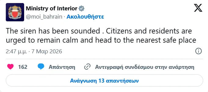 Δύο εκρήξεις ακούστηκαν στο Ντουμπάι και μία στη Μανάμα, όπου ενεργοποιήθηκαν οι σειρήνες συναγερμού. «Οι πολίτες και οι κάτοικοι καλούνται να παραμείνουν ήρεμοι και να μεταβούν στο κοντινότερο ασφαλές σημείο», έγραψε το υπουργείο Εσωτερικών του Μπαχρέιν στο Χ.