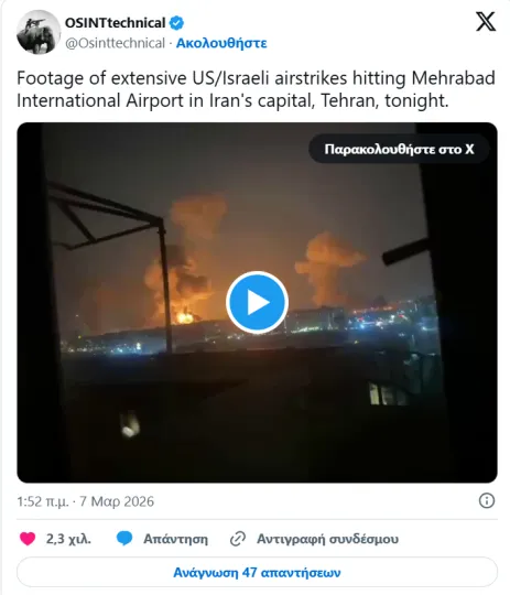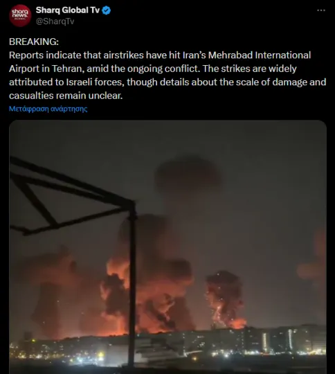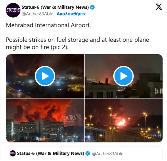 Πλάνα που αναρτήθηκαν στα μέσα κοινωνικής δικτύωσης δείχνουν πλήγματα και μεγάλες πυρκαγιές στο Διεθνές Αεροδρόμιο Μεχραμπάντ της Τεχεράνης.