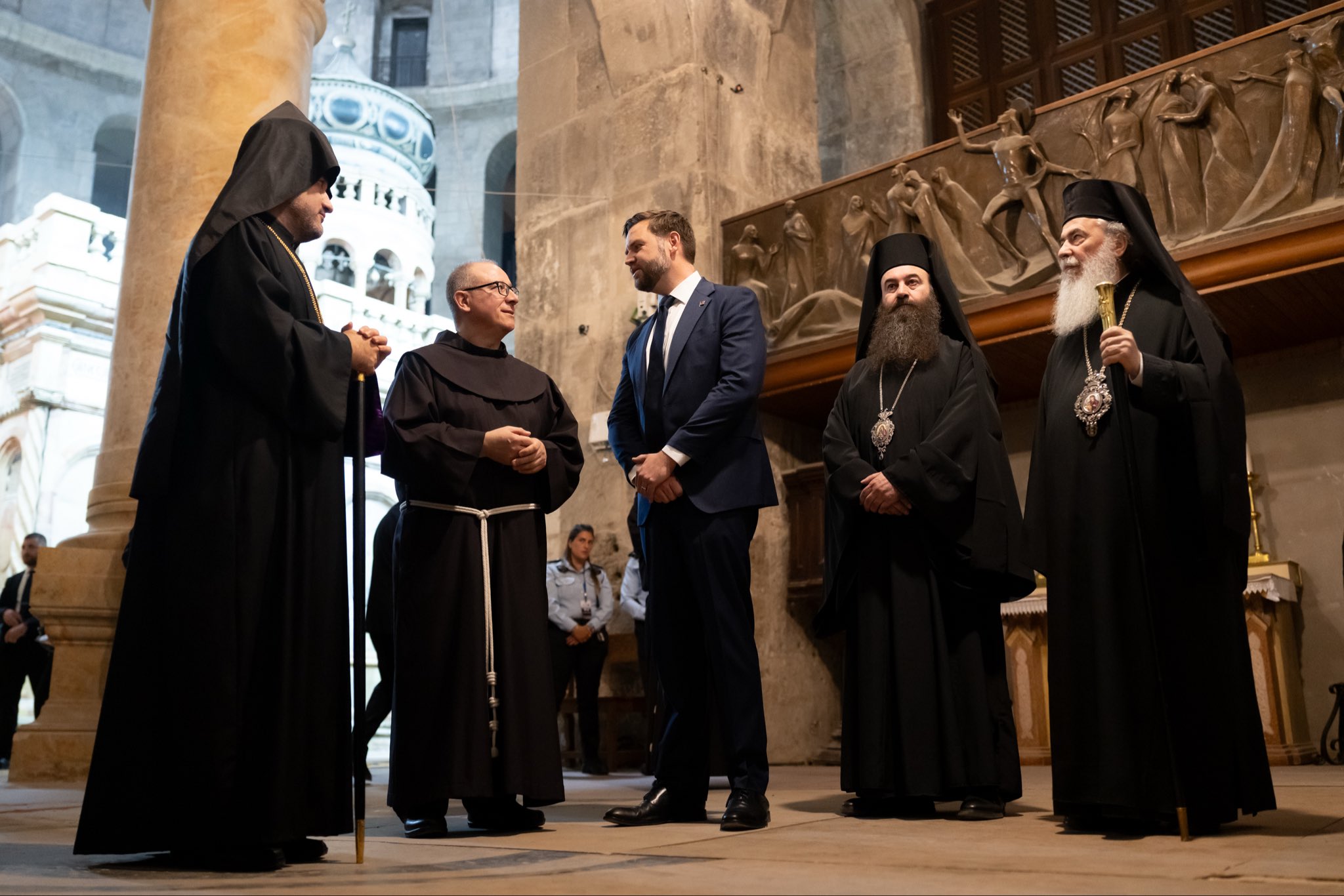 Ο Μακαριώτατος ξενάγησε προσωπικά τον αντιπρόεδρο και τη σύζυγό του στους ιερούς χώρους της Εκκλησίας, αναφερόμενος στη βαθιά σημασία της για όλη τη Χριστιανοσύνη ως τόπος της Σταύρωσης και της Ανάστασης του Κυρίου.