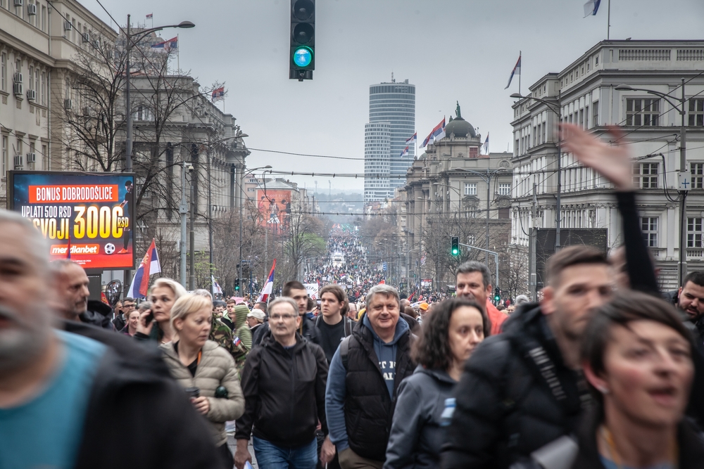 Η διαδήλωση στην πρωτεύουσα της Σερβίας προστέθηκε στο κύμα αντικυβερνητικών κινητοποιήσεων που ταλανίζουν τον πρόεδρο Αλεξάνταρ Βούτσιτς, οι οποίες ξέσπασαν μετά την κατάρρευση στέγης σιδηροδρομικού σταθμού πριν από έναν χρόνο, που είχε προκαλέσει 16 θανάτους.