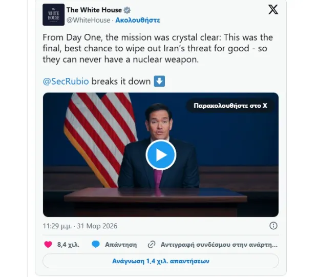 Ο Λευκός Οίκος παρέπεμψε το BBC στις δηλώσεις Ρούμπιο στο Al Jazeera ως απάντηση στο δημοσίευμα της Wall Street Journal που εμφανίζει τον Ντόναλντ Τραμπ έτοιμο να σταματήσει τον πόλεμο ακόμα και με κλειστά τα Στενά του Ορμούζ.