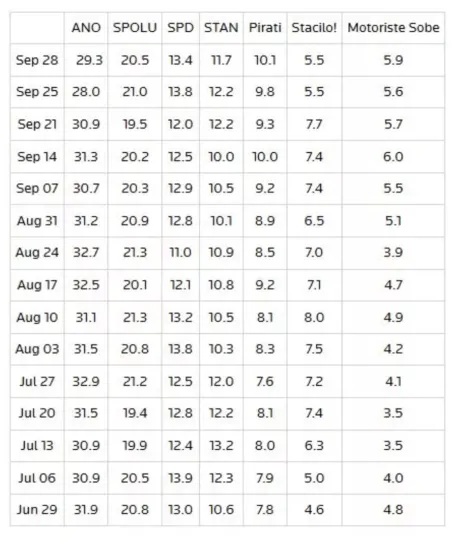 Η δημοσκόπηση του πρακτορείου STEM για το CNN Prima News δίνει σήμερα, Κυριακή, στο κόμμα ANO του Μπάμπις ποσοστό 29,3%, από 28% την περασμένη εβδομάδα, το οποίο εξακολουθεί να είναι κάτω από τους μέσους όρους του.