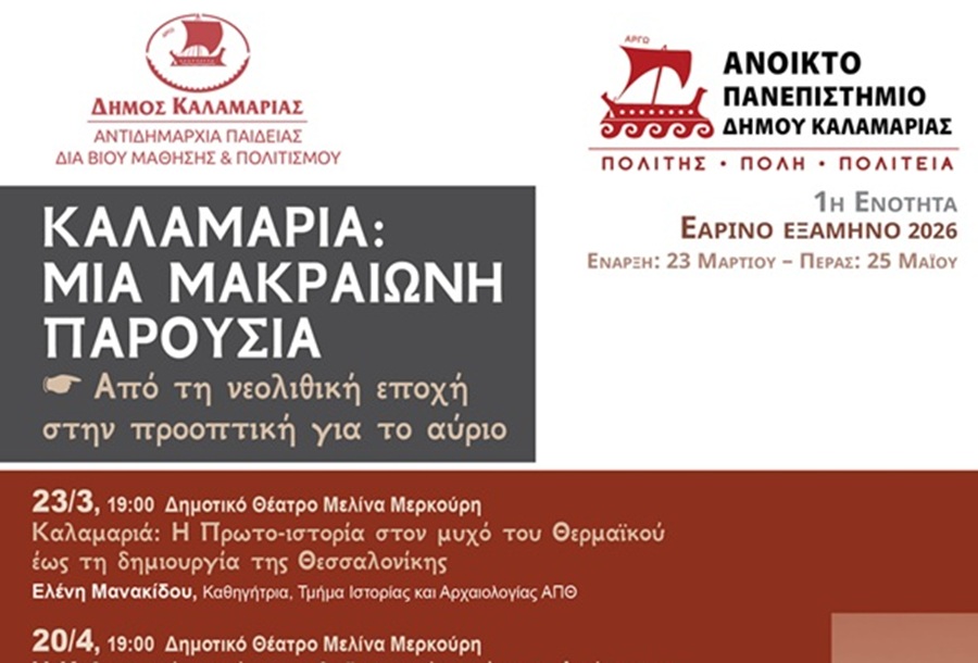 Το πρόγραμμα του εαρινού κύκλου του Ανοιχτού Πανεπιστημίου θα ολοκληρωθεί στις 25 Μαΐου με στρογγυλή τράπεζα, με θέμα «Καλαμαριά: Παρόν και Μέλλον», ανοίγοντας τον διάλογο για τη φυσιογνωμία και τις προοπτικές της πόλης.