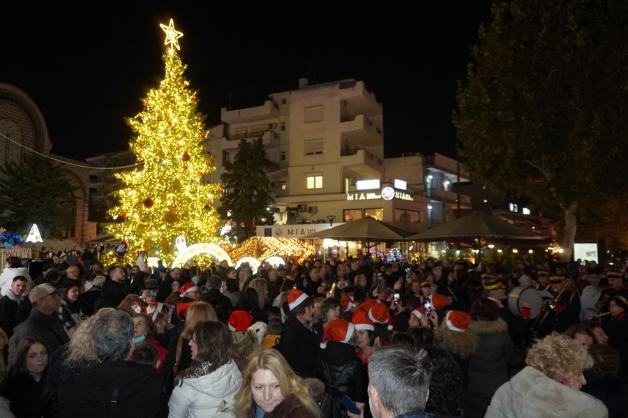 Αμέσως μετά ξεκίνησε η αντίστροφη μέτρηση και το χριστουγεννιάτικο δέντρο φωτίστηκε υπό τους ήχους της φιλαρμονικής, που έπαιξε το τραγούδι «Ω Έλατο» και τα κάλαντα των Χριστουγέννων.