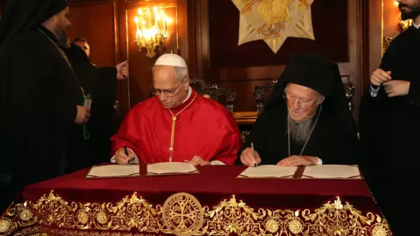 Η πατριαρχική και συνοδική θεία λειτουργία τελείται προεξάρχοντος του Οικουμενικού Πατριάρχη κ.κ. Βαρθολομαίου και συλλειτουργούντος του Αλεξανδρείας κ. Θεοδώρου, παρουσία του Πάπα Λέοντος ΙΔ’.