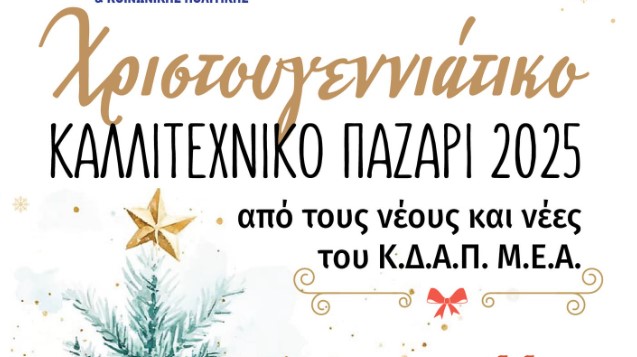 Ο δήμος Αμπελοκήπων-Μενεμένης και η αντιδημαρχία Υγείας, Πρόνοιας, Κοινωνικής Πολιτικής, Προσχολικής Αγωγής και Νέας Γενιάς προσκαλούν στο Χριστουγεννιάτικο Bazaar του ΚΔΑΠΑμεΑ που θα πραγματοποιηθεί στις 11 και 12 Δεκεμβρίου 2025, στον χώρο της δομής, στο Α΄ ΚΑΠΗ (οδός Βύρωνος με Κένεντυ).
