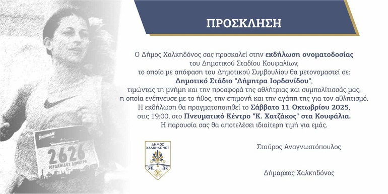 Η εκδήλωση θα πραγματοποιηθεί το Σάββατο 11 Οκτωβρίου 2025 και ώρα 19:00, στο Πνευματικό Κέντρο "Κ. Χατζάκος" στα Κουφάλια, παρουσία εκπροσώπων της Τοπικής Αυτοδιοίκησης, αθλητικών φορέων, συγγενών και φίλων της τιμώμενης.
