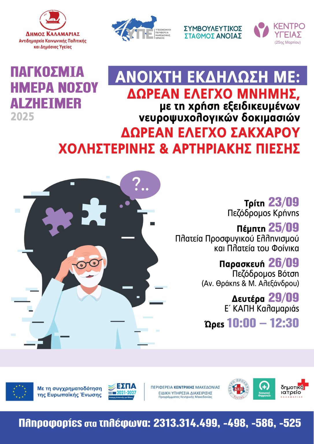 Με αφορμή τον εορτασμό της Παγκόσμιας Ημέρας Νόσου Alzheimer, που έχει καθιερωθεί η 21η Σεπτεμβρίου, ο δήμος Καλαμαριάς σε συνεργασία με την 4η Υγειονομική Περιφέρεια Μακεδονίας - Θράκης και το Κέντρο Υγείας 25ης Μαρτίου, διοργανώνει σειρά προληπτικών εξετάσεων και ενημερωτικών δράσεων για τους πολίτες.
