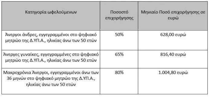 Το ποσό επιχορήγησης του κάθε ωφελούμενου σε μηνιαία βάση ανάλογα με την κατηγορία του ανέργου, ως εξής: