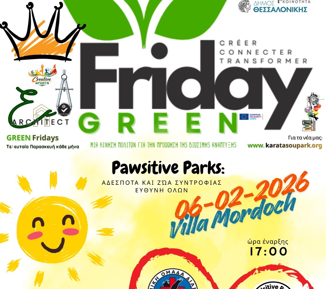 Ο Δήμος Θεσσαλονίκης και η Ε΄ Δημοτική Κοινότητα, σε συνδιοργάνωση με τον Πολιτιστικό Οργανισμό Μακεδονίας – Θράκης «Εσαεί εν Ροή», διοργανώνουν ανοιχτή εκδήλωση στο πλαίσιο της Green Friday, με στόχο τη διάχυση των αποτελεσμάτων της καμπάνιας για τα αδέσποτα ζώα.