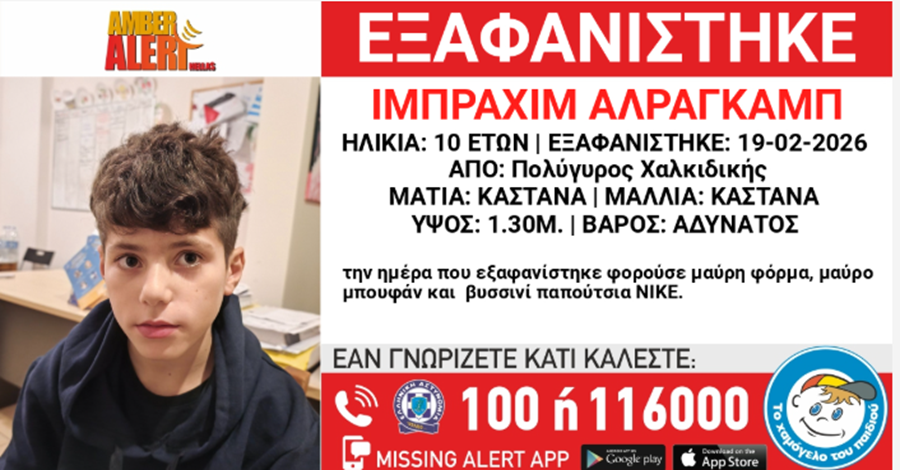 Τον μηχανισμό Amber Alert Hellas ενεργοποίησε κατόπιν εισαγγελικής εντολής «Το Χαμόγελο του Παιδιού» για την εξαφάνιση 10χρονου σήμερα το πρωί από χώρο φιλοξενίας ασυνόδευτων ανηλίκων, στον Πολύγυρο Χαλκιδικής.