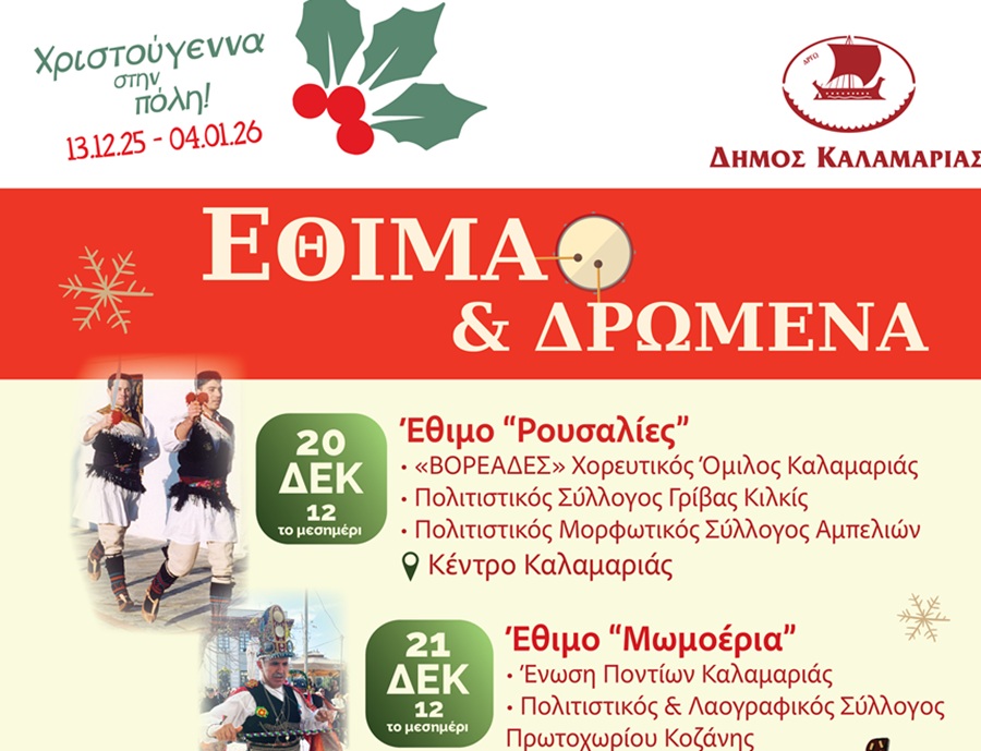 Στο πλαίσιο των χριστουγεννιάτικων εκδηλώσεων του Δήμου Καλαμαριάς, αναβιώνουν παραδοσιακά δρώμενα με βαθιές ρίζες στην κοινωνία, στα ήθη και τα έθιμα του τόπου μας. Έθιμα που έφθασαν μέχρι σήμερα από τη Μακεδονία, τον Πόντο και την Μικρασία, μεταφέροντας αξίες, συμβολισμούς και το αυθεντικό πνεύμα των ημερών.