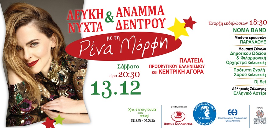 Λίγο μετά τις 20.00 η Δήμαρχος Καλαμαριάς Χρύσα Αράπογλου ανάβει το Χριστουγεννιάτικο Δέντρο στην Πλατεία Προσφυγικού Ελληνισμού, δίνοντας επίσημα το σύνθημα για την έναρξη της πιο μαγικής περιόδου του χρόνου και αμέσως μετά η κεντρική σκηνή γεμίζει φως και μουσική, καθώς η Ρένα Μόρφη θα χαρίσει μια μεγάλη