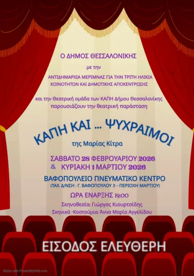 Η Θεατρική ομάδα των ΚΑΠΗ του δήμου Θεσσαλονίκης παρουσιάζει την απολαυστική κωμωδία της Μαρίας Κίτρα, «ΚΑΠΗ ΚΑΙ … ΨΥΧΡΑΙΜΟΙ». Η παράσταση θα ανέβει το Σάββατο 28 Φεβρουαρίου και την Κυριακή 1 Μαρτίου 2026, στις 19:00, στο Βαφοπούλειο Πνευματικό Κέντρο.
